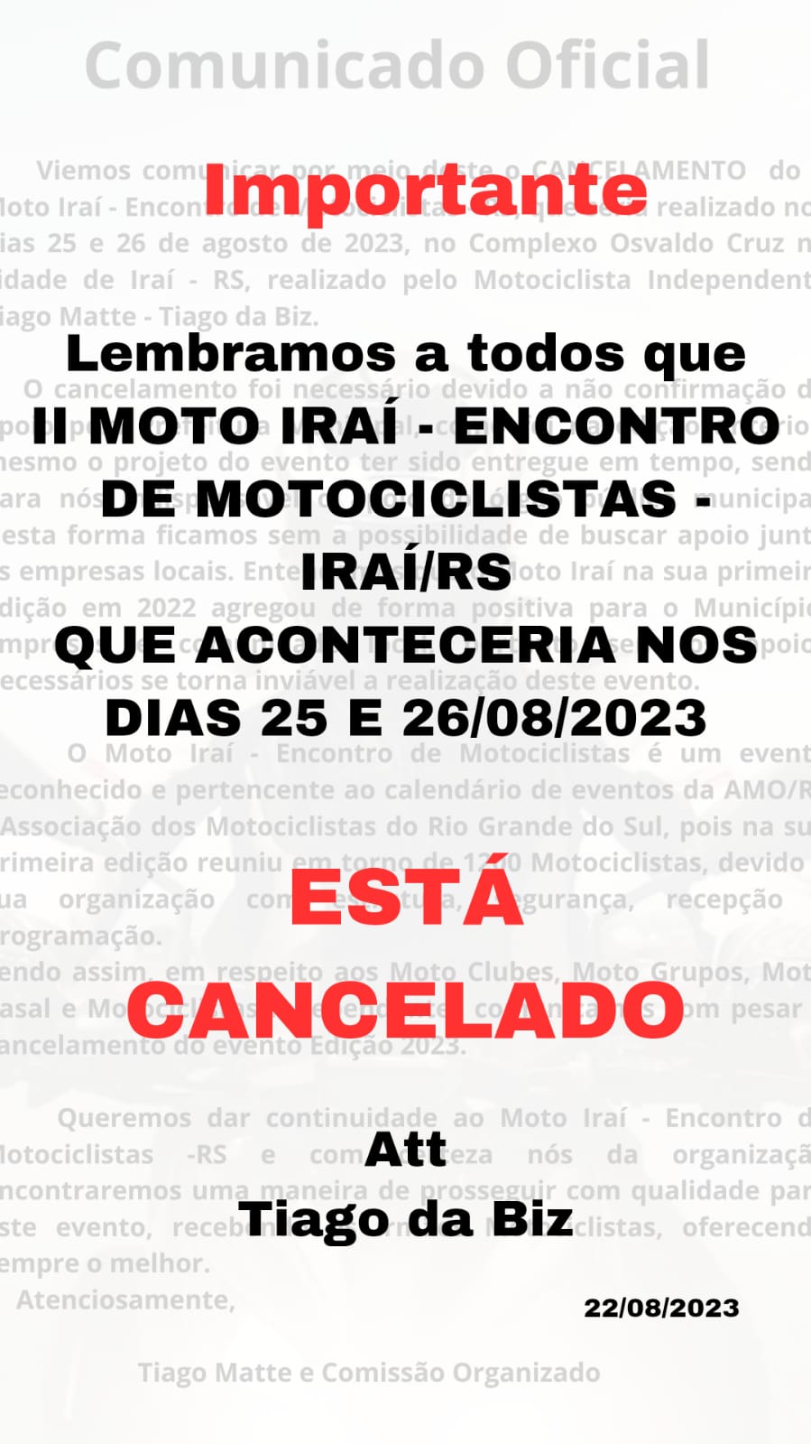 CANCELADO - DE 25 A 26/08/2023 - II MOTO IRAÍ - ENCONTRO DE MOTOCICLISTAS - IRAÍ - RS
